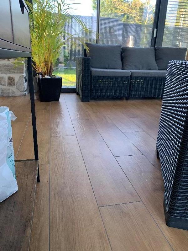 Sol de véranda avec lames de carrelage imitation bois 20x120 pose classique